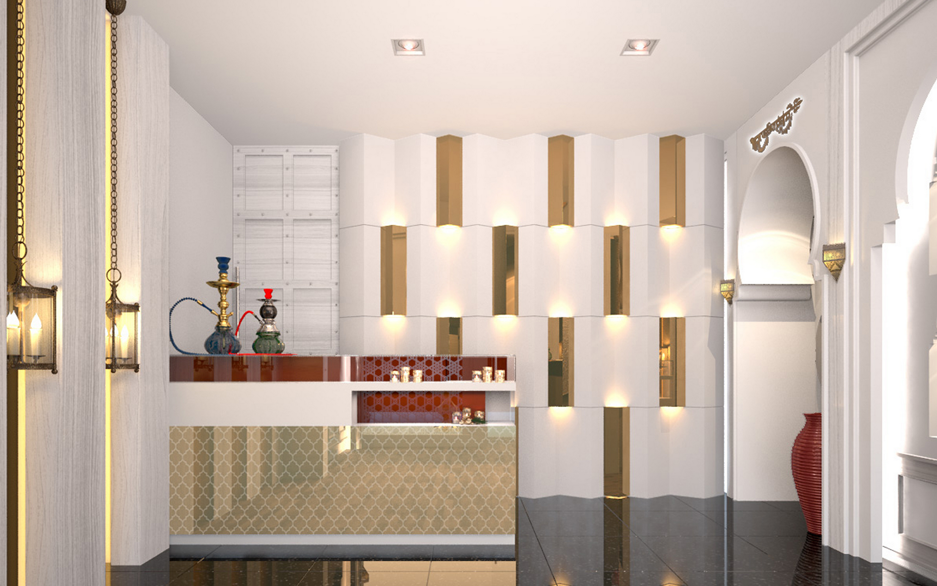 สำหรับการตกแต่งภายใน ที่มีกลิ่นอายของความเป็นอาหรับด้วยการตกแต่งที่ให้สอดคล้องกับลักษณะ และจุดประสงค์ของทางร้าน เป็นการประยุกต์นำเอาวิธีการตกแต่งให้เข้ากับความคลาสสิกของสไตล์อินเดียประดับงานกระจก และงานฉลุลวดลายสุดวิจิตรให้อารมณ์หรูหรา ด้วยการจัดวางง่ายๆ สร้างความสัมพันธ์ของทุกอย่างเป็นระบบกราฟิก คือใช้เส้นพื้นรวมทั้งลวดลายวัสดุให้ต่อเนื่องกันใช้พื้นผิวสัมผัสเรียบๆ และโทนสีอบอุ่นแบบเอเชีย