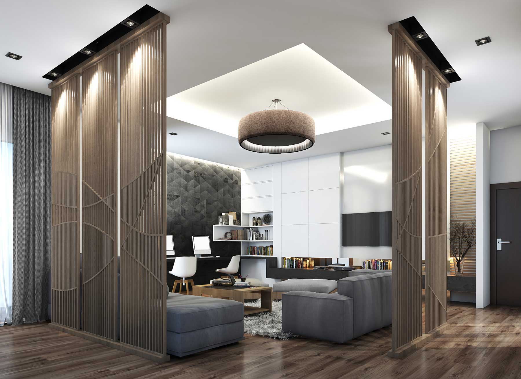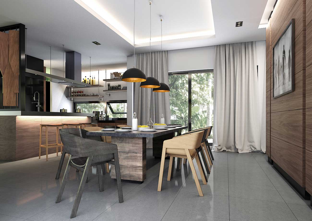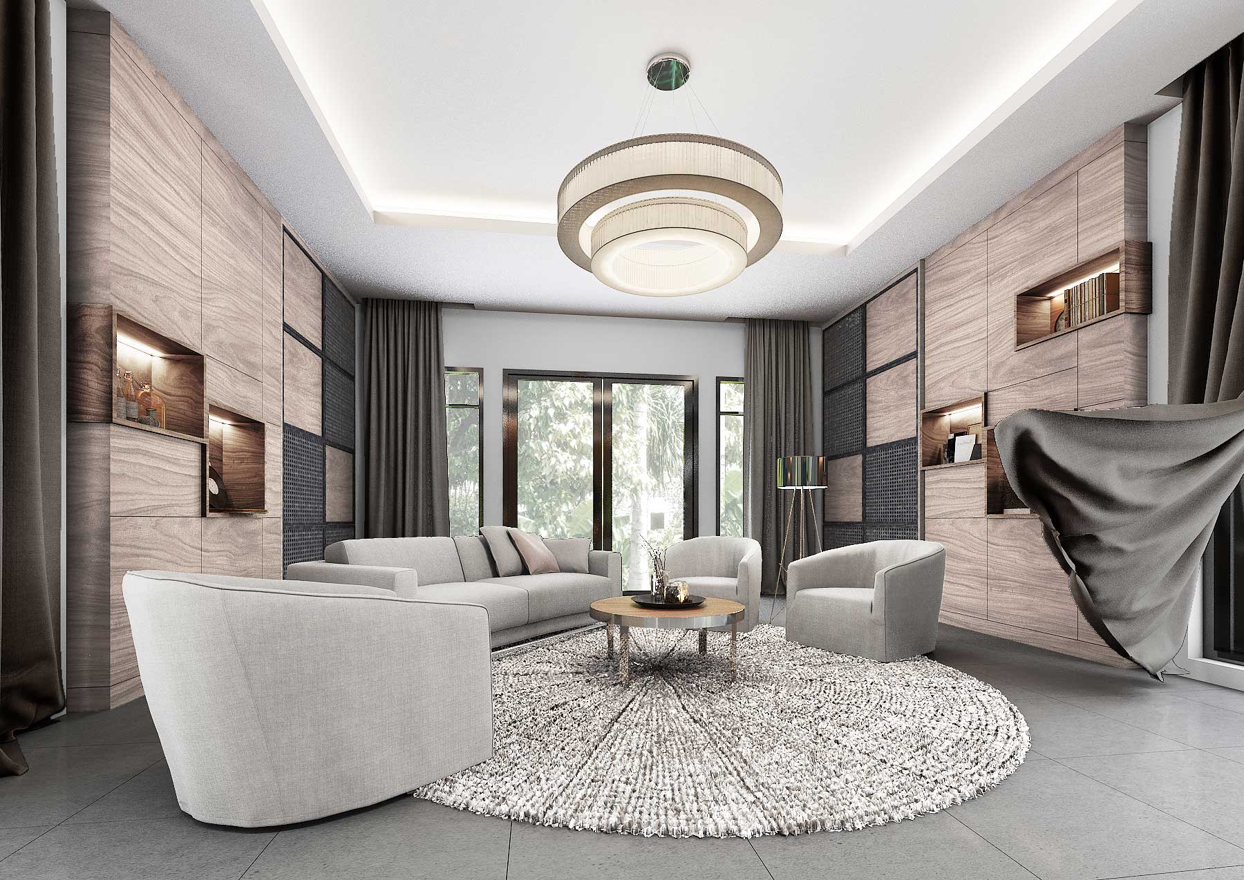 The designer selected a variety of materials, combining natural elements such as wood and stone with modern ones like glass, metal, and stainless steel. The chosen color palette white, gray, beige, and earth tones enhances the home's classic and visually pleasing appearance. These choices create a simple, elegant ambiance that harmonizes seamlessly with the surrounding environment.