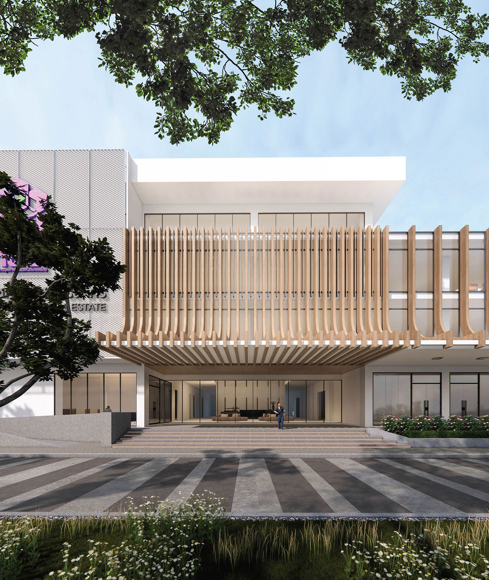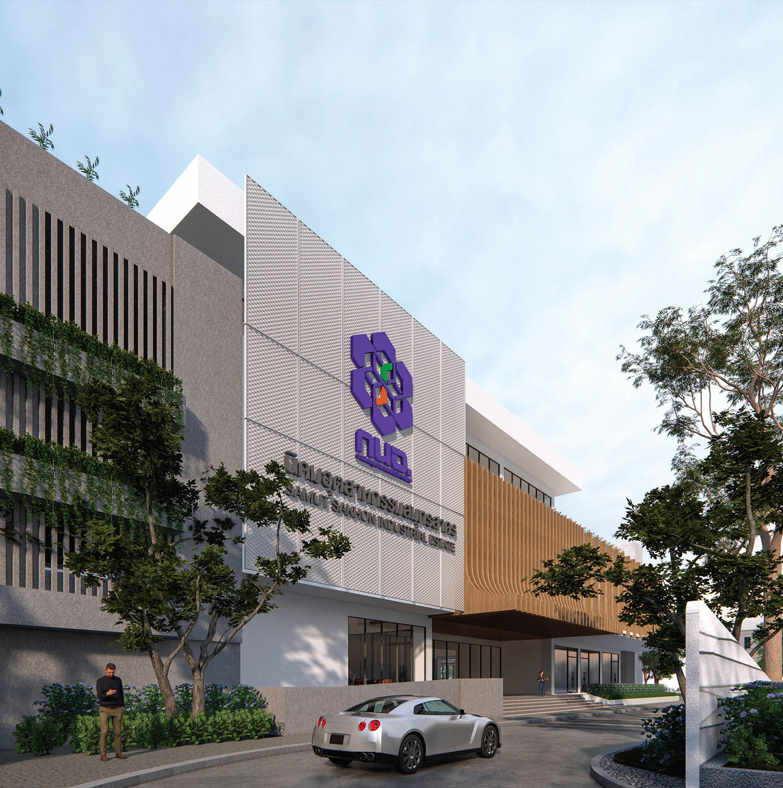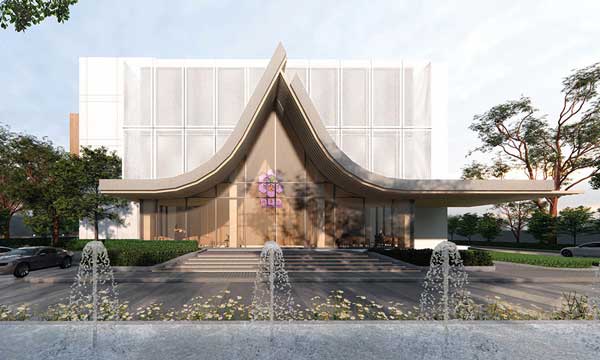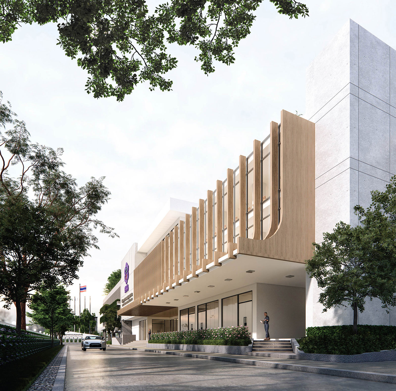 The design of the Samut Sakhon Industrial Estate Office Building was inspired by the provincial emblem of Samut Sakhon, which features a Chinese junk sailing on the sea, with a factory and chimney in the background—symbolizing the region’s prosperity from past to present. This emblem became an integral part of the building’s design. The designer drew inspiration from its imagery, incorporating the curved shape of the junk’s sail into the roof and the sunshade at the front of the building.